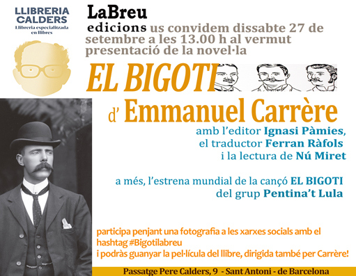 Aquest començament de curs tenim diverses cites literàries. La primera és aquest 27 de setembre a la Llibreria Calders, on presentem un llibre de la breu: El bigoti, d’Emmanuel Carrère amb Ignasi Pàmies, Ferran Ràfols i Nú Miret. Per aquesta ocasió, Pentina’t Lula, ha creat una cançó homònima que estrenarem mundialment dissabte 27 de setembre a la 13h